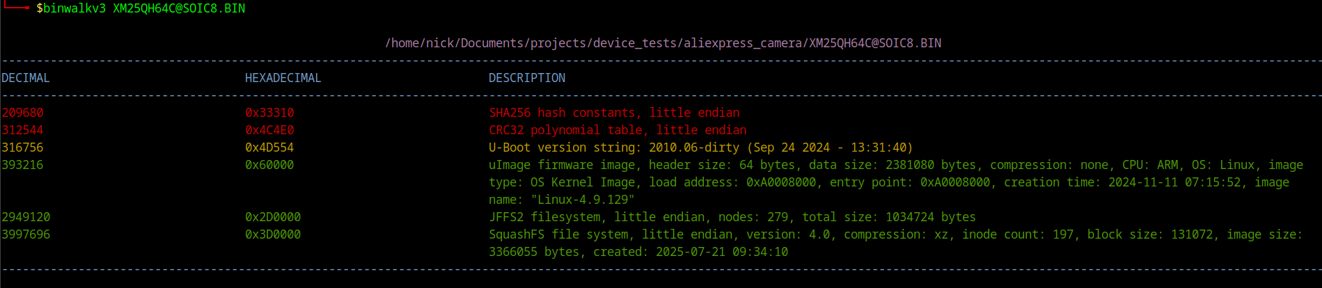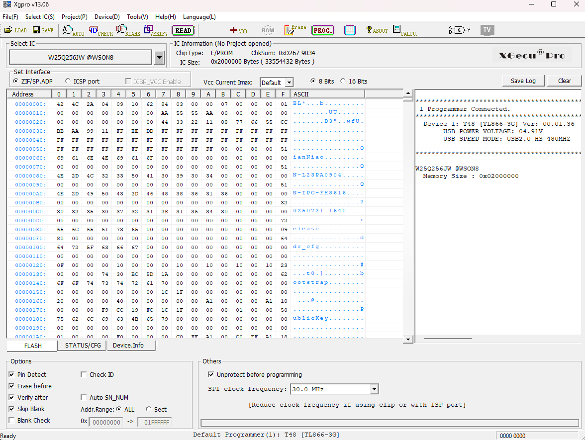 Took 2 reads to make sure I got the same result, confirmed via md5sum. Dump size was 32MB but strings in the firmware shows that it should be 8MB.
