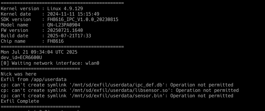 TLDR: The camera blindly copies and executes a shell script from any inserted SD card as root during boot. An attacker with physical access can achieve persistent root-level code execution.